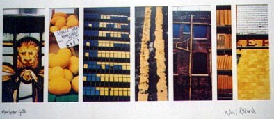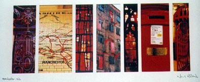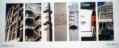 Green From left: Cornerhouse cinema; W3 buildling, Whitworth Street; Gents' urinals, Lass O'Gowrie; Great Northern Warehouse reflecting G-Mex; three Morris Minor cars, Chorlton; tiles at Shaw & Shaw, 1924; columns at Greek Orthodox Church, Bury New Road. |