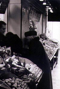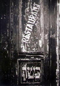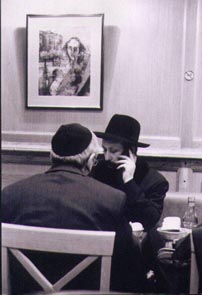 Prayer Two Orthodox Jewish men at a cafe table in Le Marais. Notice how the man on the mobile mirrors the position of the character in the painting behind holding the Torah scrolls. Supplied as limited edition, individually signed by the artist, in a 18" x 24" mount (mount size is approx 4"). Mounts are white unless specifically requested otherwise. Price: £73 + postage. See price list. |
