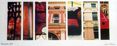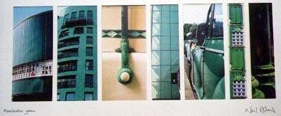 Green From left: Cornerhouse cinema; W3 buildling, Whitworth Street; Gents' urinals, Lass O'Gowrie; Great Northern Warehouse reflecting G-Mex; three Morris Minor cars, Chorlton; tiles at Shaw & Shaw, 1924; columns at Greek Orthodox Church, Bury New Road. |